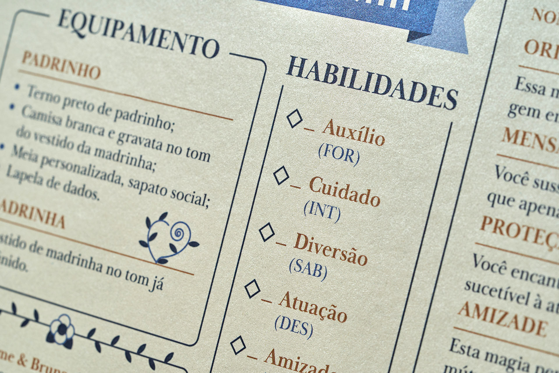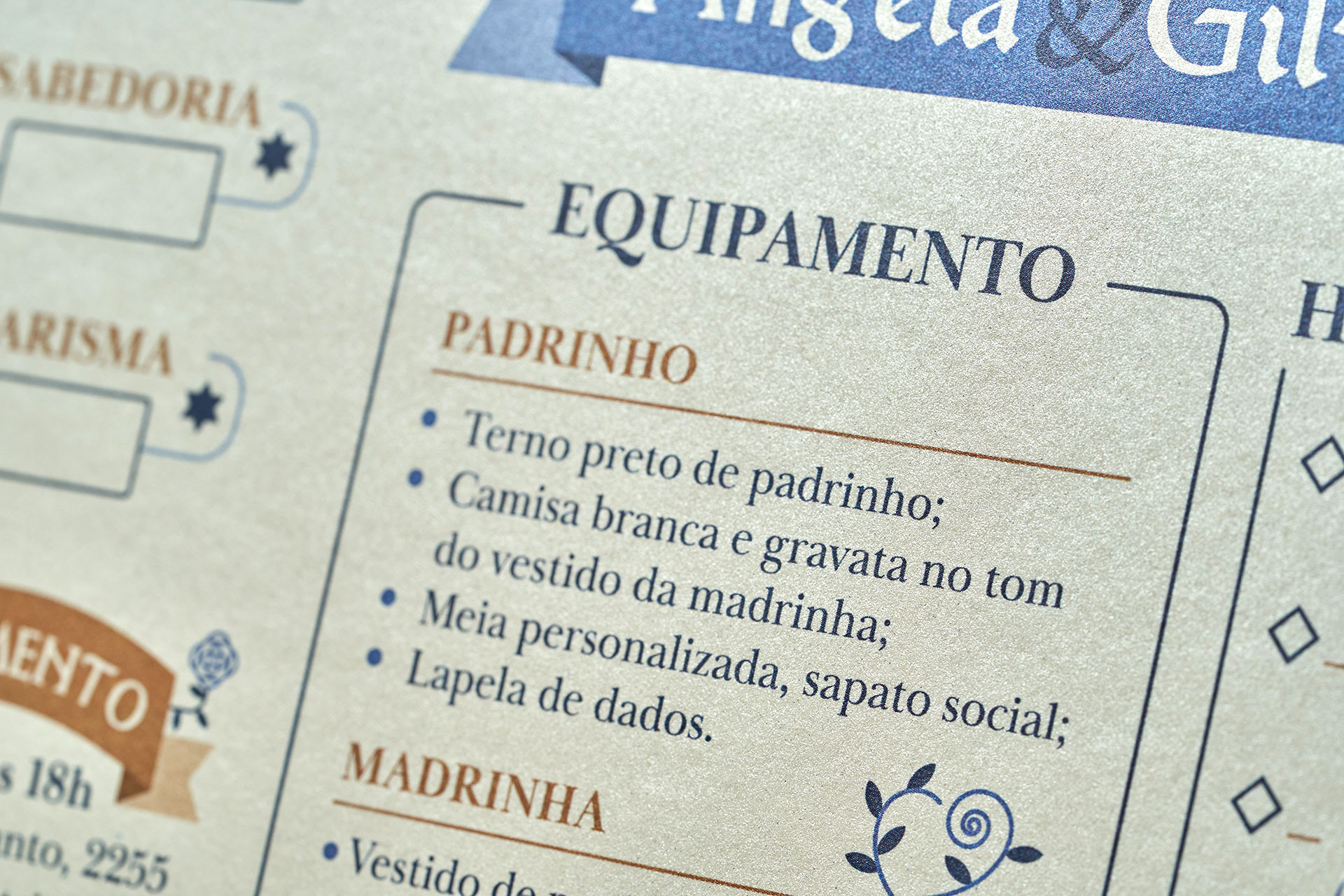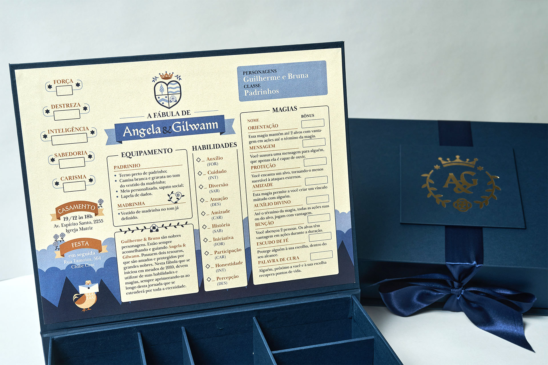 O convite aos padrinhos de casamento foi criado no formato de ficha de RPG (Role Playing Games: jogos em que se interpreta um papel). Cada padrinho recebeu uma caixa cheia de objetos que ele irá precisar para cumprir seu "papel" na história, junto com uma ficha descrevendo as características do seu “personagem”.