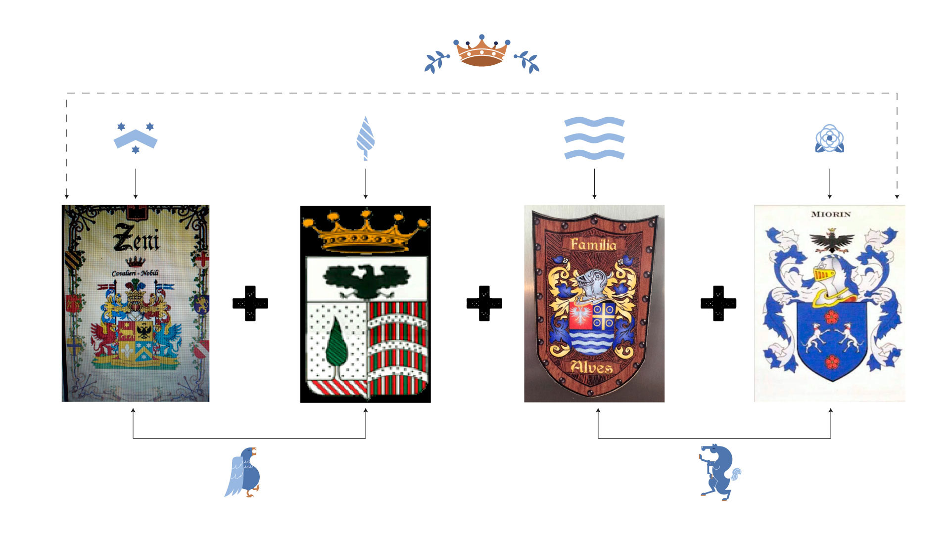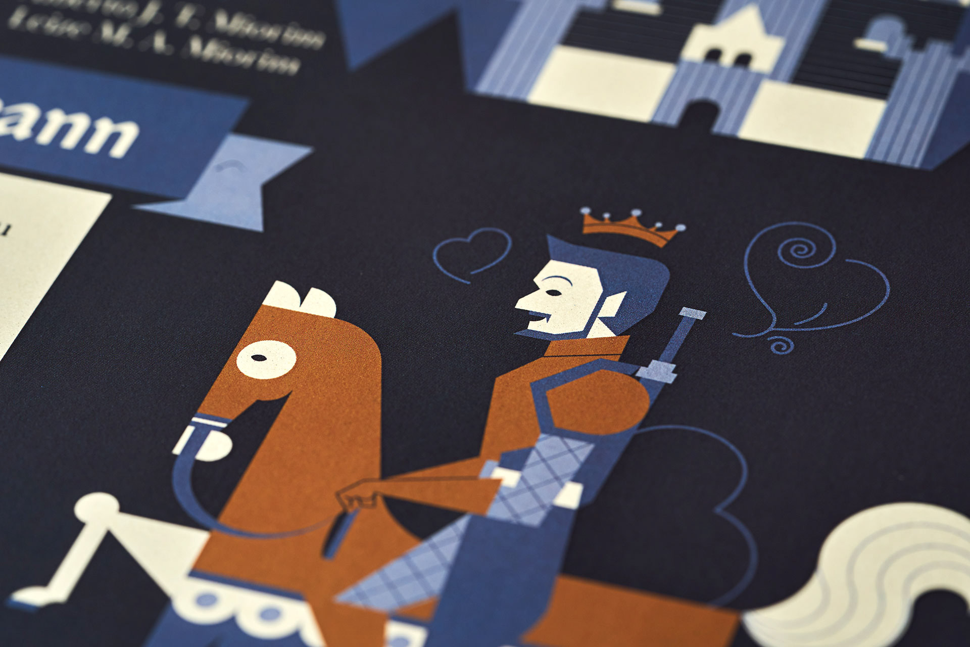 We created a coat of arms inspired on medieval heraldic, mixing elements of the Arms of the 4 families that unite in the wedding, creating an element with unique personality to be used as the signature of the couple in every material of the wedding.