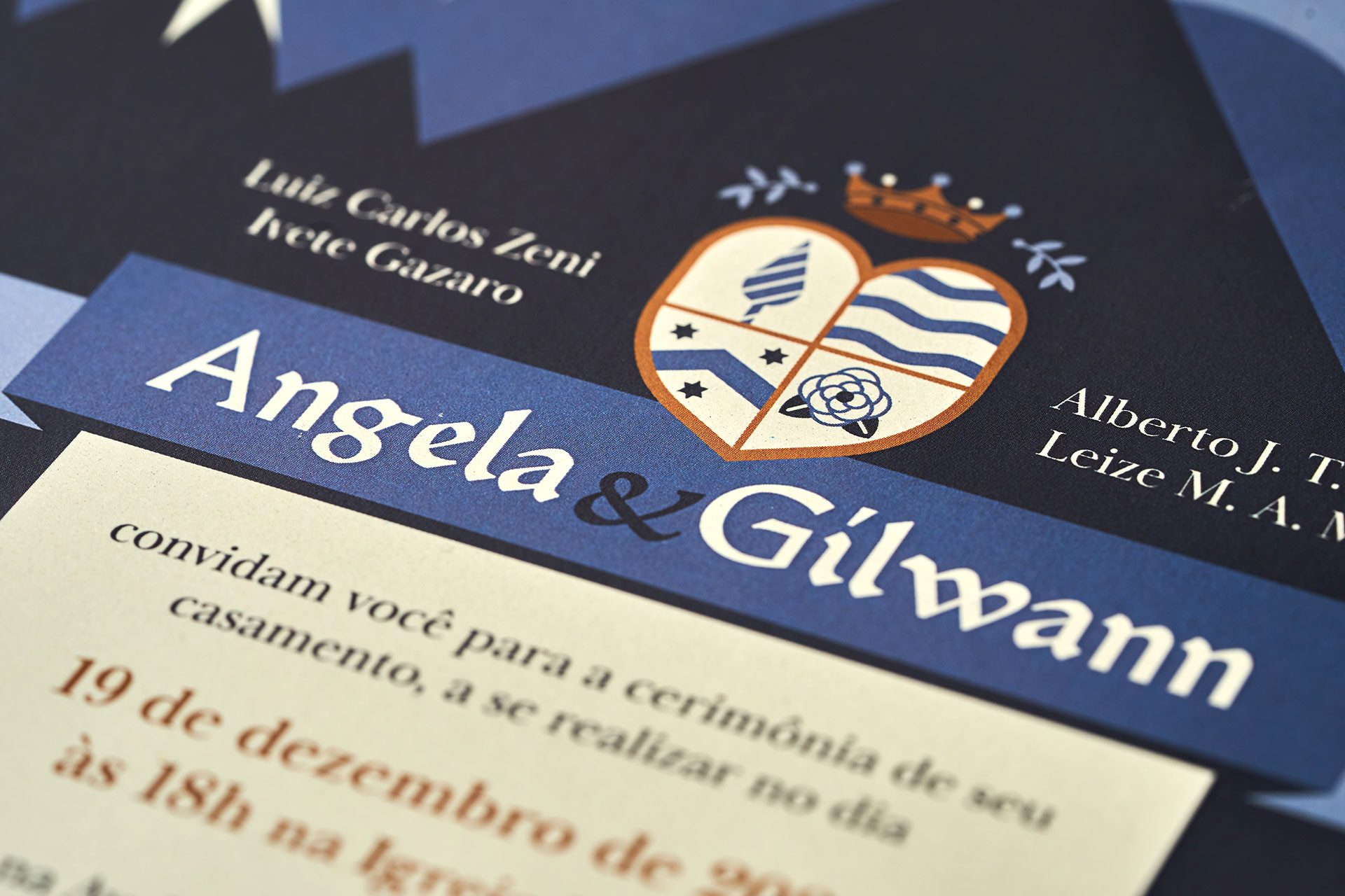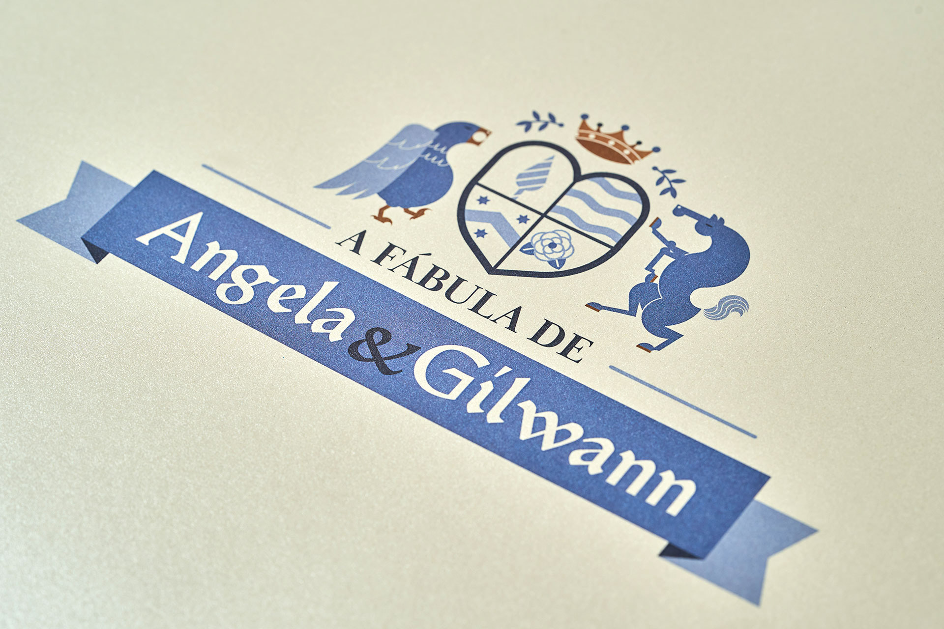 Criamos um brasão inspirado na heráldica medieval, misturando elementos dos brasões das 4 famílias que se unem no casamento, criando um elemento de personalidade única a ser usado como assinatura do casal em todos os materiais do casamento.